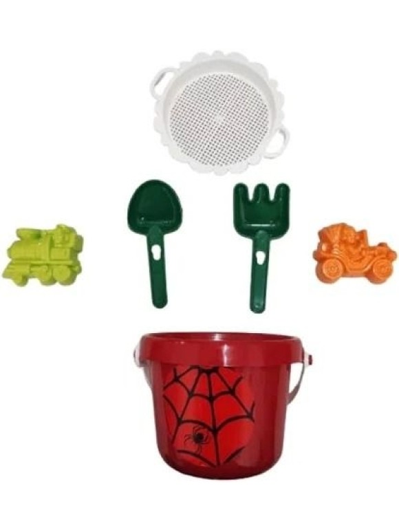 Descrição adicional: Balde com alça + peneira + pá + rastelo + duas forminhas de areia. Cores sortidas.